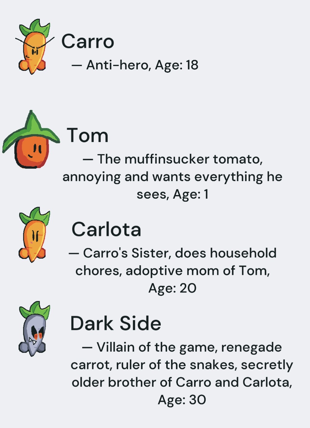 Check out my game! it's called "Carro The Carrot". This are the characters:
